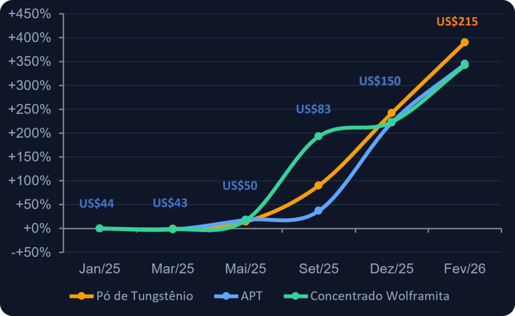 | Nova escalada em janeiro de 2026 Em 6 de janeiro de 2026, a China publicou novas regras proibindo exportações de óxidos e carbonetos de tungstênio para diversos países. Os especialistas do setor são unânimes: os preços não voltarão mais ao patamar de 2024. |